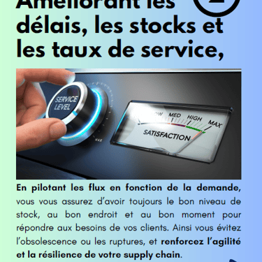 En pilotant les flux en fonction de la demande, vous vous assurez d’avoir toujours le bon niveau de stock, au bon endroit et au bon moment pour répondre aux besoins de vos clients. Ainsi vous évitez l’obsolescence ou les ruptures, et renforcez l’agilité et la résilience de votre supply chain.